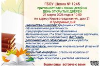 ГБОУ Школа № 1245 приглашает вас и ваших детей на День открытых дверей, который состоится 21 марта 2026 года в 10:00 по адресу: ул. Кировоградская, дом 21.